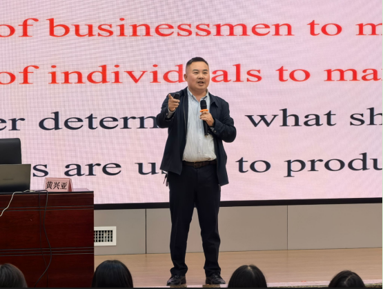 黄兴亚老师以轻松诙谐的开场白拉近了与同学们的距离,现场氛围迅速活跃起来。针对学生英语学习中普遍存在的“单词背得多、运用不灵活”“复杂句看不懂、翻译写不顺”等痛点,黄老师精准切入,系统讲解了“组词成句、组句成段、组段成章”的三阶英语学习方法。他结合英语四级词汇和场景案例,生动阐释了如何从基础词汇出发,通过合理搭配构建正确句式,再依托逻辑衔接将句子串联成连贯段落,最终形成结构完整、表达流畅的文章,让抽象的学习方法变得直观易懂。他现场选取四级真题中的典型复杂句,通过“拆解主干—分析修饰成分—还原逻辑关系”的步骤,手把手指导同学们如何快速剥离冗余信息、抓住句子核心,精准理解句意。针对翻译题型,黄老师强调“先理清中文逻辑,再匹配英文句式”,结合常见中式表达的误区案例,传授了“语序调整、词性转换、固定搭配运用”等实用技巧,切实提升答题准确率和效率。