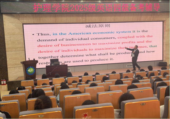 云中讯(通讯员 王瑞欣)2025年11月14日,护理学院在翰墨楼一楼报告厅开展2025级新生英语四级备考辅导。学院特邀经验丰富的黄兴亚老师主讲,全体2025级本科学生参加辅导。