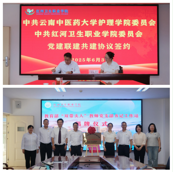 活动中,双方签署《党建联建共建协议》,并举行教育部“双带头人”教师党支部书记工作站揭牌仪式。随后,两校护理学院围绕“党建引领专业建设”“课程思政育人实践”“学生社区党建模式”等主题展开经验交流。