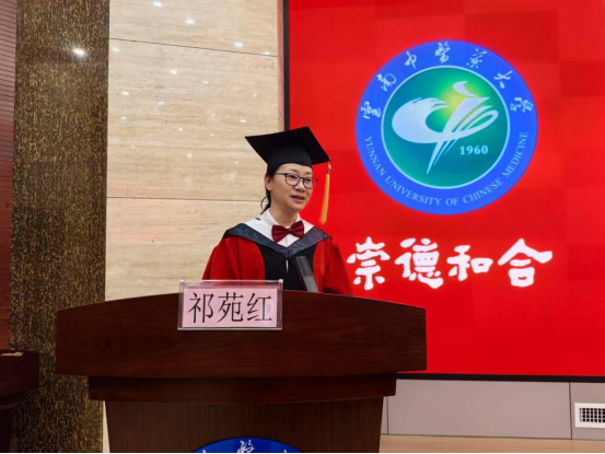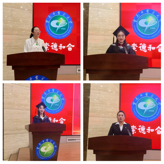 教师代表王瑞欣从辅导员视角,鼓励毕业生“先就业、再择业”,突出中医护理技术优势,关注新兴领域,叮嘱毕业生制定职业规划,提升综合能力,在智慧护理浪潮中勇当先锋。本科毕业生代表王勐莹分享了从大山深处走向西部计划的抉择,号召同窗“以专业素养筑牢健康中国的砖瓦”。毕业研究生代表左毅玲则以厦门大学马来西亚分校学习经历为例,阐述中医药文化在跨文化语境中的传播,鼓励大家讲好中医护理故事。宿管代表王翠娟的发言充满温情,她提醒毕业生“熬夜时泡杯热茶”“困难时别独自扛着”,朴实的话语中流露着对学生的牵挂。