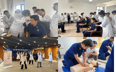 之后,党员同志们为消防队员提供中医护理义诊服务,包括耳穴埋籽、穴位按摩、教授八段锦养生操等,以帮助消防队员们舒缓压力、强身健体,同时针对消防队员们救援中对于CPR急救技能的需求,同学们为消防队员们讲述CPR急救技能的操作方法和要点,并现场示范、指导消防队员们操作练习。
