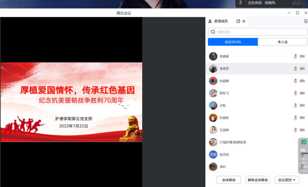 云中迅(通讯员 段晓萍 王瑞欣)7月22日,护理学院第五党支部通过腾讯会议平台开展“厚植爱国情怀,传承红色基因”主题党日活动。本次会议由罗如飞同志主持,段晓萍同志领学,支部全体党员参加学习。