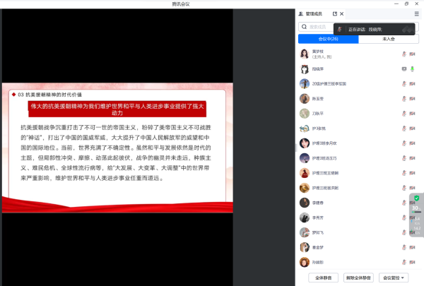 段晓萍同志带领大家回顾了抗美援朝战争的主要历程,解读了抗美援朝精神的丰富内涵。新中国成立之初,肩负伟大历史使命的中国人民志愿军在中国共产党的领导下,以勇毅和智慧同朝鲜人民并肩作战,打败以美国为首的“联合国军”和南朝鲜军队,赢得战争的伟大胜利。中国人民志愿军忠于祖国和人民、为了国家统一和民族尊严奋不顾身的爱国主义情怀;英勇顽强、舍生忘死的革命英雄主义;为完成祖国和人民赋予的使命、慷慨奉献自己一切的革命忠诚精神令全体党员动容。