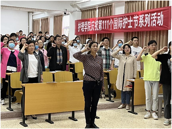 活动三:5月12日下午,在护理学院实验室9102教室,学院党委书记、院长毕怀梅带领全体党员师生重温南丁格尔誓言,在庄严的宣誓声中,师生们对护士作为白衣天使的职业神圣感进一步增强,对南丁格尔精神的大爱情怀更加强化。宣誓结束后,护理学院第一党支部书记郭趣老师以南丁格尔立志和创立护理学事业为主线,向全体师生上了一堂生动的护理精神思政课,更加激发了同学们现身职责使命的热情。最后,师生们结合对南丁格尔精神的认识以身边的抗疫故事为背景分享了自己的学习感悟,畅谈了身为护理人的教育与自豪。