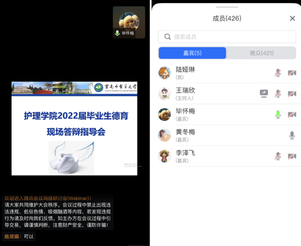 云中讯(通讯员 王瑞欣)5月12日晚,护理学院通过腾讯会议平台召开了2022届毕业生德育论文现场答辩工作部署会议,学院党委书记、院长毕怀梅、学生管理办公室辅导员参加会议,会议由学管办主任黄冬梅主持。