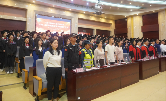 毕业典礼在雄壮激昂的国歌声中拉开帷幕,与会人员一起观看了护理学院2024届毕业留念VCR。