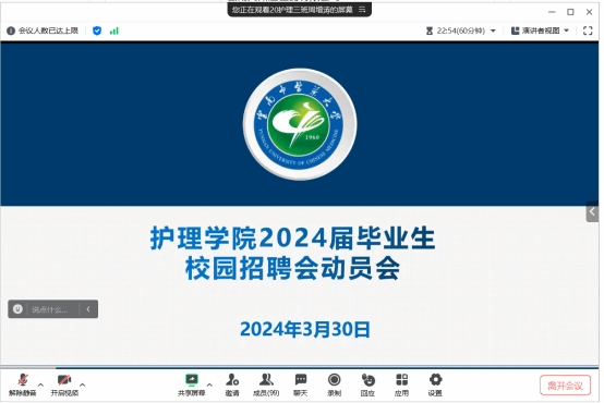 云中讯(通讯员周增涛)3月30日晚,护理学院召开2024届毕业生校园招聘动员会。2024届全体毕业生参加动员会,学院党委副书记黄冬梅、学工办负责人田桂兰对毕业生进行动员。